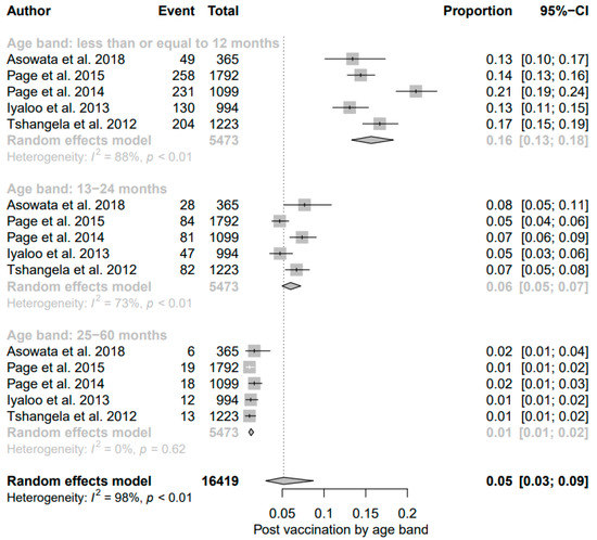 Subgroup analysis of rotavirus prevalence during post-vaccination era according to age group.