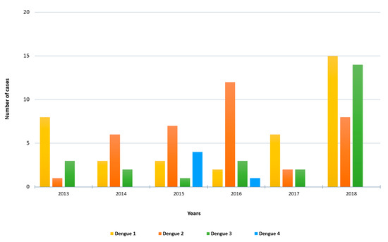 Number of imported RT-PCR-positive dengue cases by year and DENV serotype included in the study.