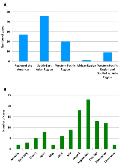 Geographic and monthly distribution of RT-PCR-positive imported dengue cases. (A) Number of imported RT-PCR-positive dengue cases by WHO region between 2013 and 2018. No cases were detected in travelers returning from the Eastern Mediterranean Region or the European Region. (B) Number of imported RT-PCR-positive dengue cases by month between 2013 and 2018.