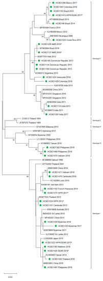 - Wittke, V.; Robb, T.; Thu, H.; Nisalak, A.; Nimmannitya, S.; Kalayanrooj, S.; Vaughn, D.; Endy, T.; Holmes, E.; Aaskov, J. Extinction and Rapid Emergence of Strains of Dengue 3 Virus during an Interepidemic Period. Virology 2002, 301, 148–156. [Google Scholar] [CrossRef] [Green Version]