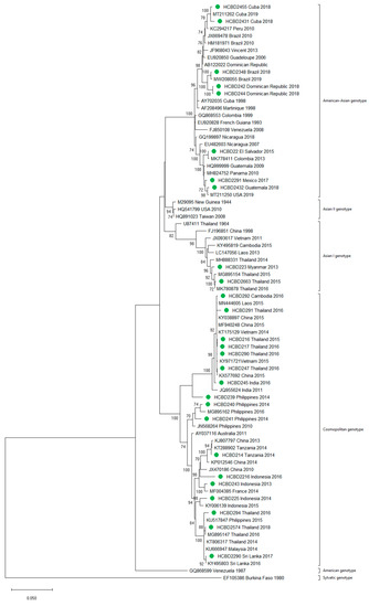 - Liu, L.; Wu, T.; Liu, B.; Nelly, R.M.J.; Fu, Y.; Kang, X.; Chen, C.; Huang, Z.; Wu, B.; Wang, J.; et al. The Origin and Molecular Epidemiology of Dengue Fever in Hainan Province, China, 2019. Front. Microbiol. 2021, 12. [Google Scholar] [CrossRef]