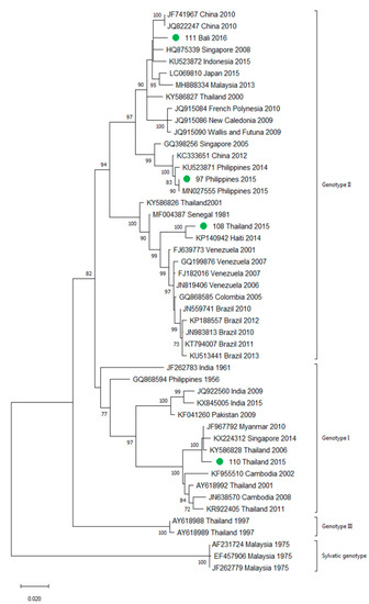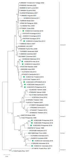 (1) Dengue serotype 1 (DENV-1) is divided into five genotypes (I–V): DENV-1 genotype I includes strains from Southeast Asia, China and East Africa; genotype II includes strains from Thailand (1950s–1960s); genotype III is represented by a sylvatic strain detected in Malaysia; genotype IV includes strains from the West Pacific islands and Australia. Recently, a sixth genotype (VI) has been proposed based on the divergence of a sylvatic strain imported from the rainforests of Brunei [14];