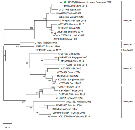 In October 2018, a male in his twenties in the Province of Barcelona sought medical attention with headache and weakness. General hematological and biochemical blood tests were normal, and the patient was discharged with symptomatic treatment. Five days later, he presented with fever (38 °C) and nausea, and two days later with rash. A paranasal sinus radiography was normal. Blood tests showed slight leucopenia and thrombocytopenia, and he was diagnosed with a probable viral infection, with follow-up at the internal medicine department. The next day, he sought medical attention for persistence of fever and gastrointestinal symptoms, as well as progression of the rash. Blood tests showed leucopenia (2350/µL) and thrombocytopenia (83,000/µL). Tests for other viral infections such as cytomegalovirus, Epstein–Barr virus and human immunodeficiency virus were negative. Weakly positive IgM against parvovirus B19 were detected, but the patient tested negative in the follow-up samples. A dengue virus infection was suspected during the last visit, and serological tests for DENV were IgM-positive and IgG-negative. As the patient had no recent history of traveling, a probable autochthonous dengue case was considered, and retrospective acute samples as well as follow-up samples were obtained. Confirmation of the diagnosis was obtained by detection of DENV RNA and DENV NS1 antigen in the stored samples from the first days of illness. Seroconversion of IgG was also detected in the follow-up samples. This represented the first case of locally transmitted dengue in Northeastern Spain. No other autochthonous cases were detected. DENV-1 genotype I was identified using the molecular analysis and no analogous DENV-1 strain was detected among the imported cases analyzed in this study, in agreement with the public health surveillance data that had not detected any epidemiologically linked cases in travelers that could represent the source of the transmission. The complete sequences of the E and NS1 genes were amplified and used for further phylogenetic analysis (Figure 7). The strain clustered with other described DENV-1 Asian genotype I viruses. The patient featured complete resolution of symptoms and remained asymptomatic throughout the follow-up medical visits. Since autochthonous dengue was also detected in Murcia (Southeastern Spain) in August 2018, an interim analysis was conducted with the Spanish National Center for Microbiology comparing both strains (from Murcia and from Barcelona). The two strains grouped differently with other Asian strains, and therefore two different introductions of dengue in Spain leading to local transmission were concluded (data not shown).