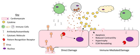 Mechanisms of viral myocarditis. A large number of viruses can infect cells of the heart and promote damage. They can promote direct damage by lysing host cells. Additionally, host cells are equipped with pattern recognition receptors that bind the virus and promote the expression of pro-inflammatory cytokines. While these cytokines can recruit immune cells that are necessary for viral clearance, they can also impair the function of uninfected myocytes by promoting apoptosis, reducing contractility, driving cardiomyocyte hypertrophy, and facilitating remodeling of the extracellular matrix. Furthermore, the immune cells recruited to the myocardium can damage uninfected myocytes through the release of cytotoxic molecules or through the production of autoantibodies.