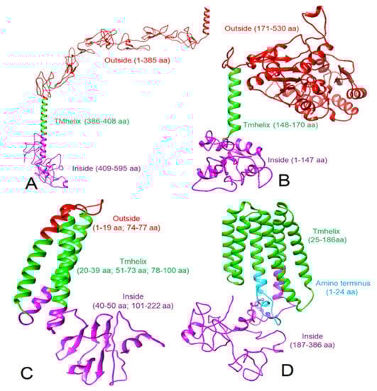 Modeled 3D structures (ribbon view) of proteins and their topology. (A) Human CD30, (B) human CD15, (C) SARS-CoV-2 M protein, and (D) Epstein-Barr virus LMP-1 protein. Note: the red color shows the extracellular location and corresponding amino acid residues, green shows the transmembrane location and corresponding amino acid residues, and purple color indicates the intracellular or cytoplasmic location and corresponding amino acid residues.