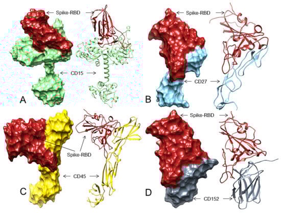 The 3D structures (surface and ribbon views) of human CDs and the Spike-RBD interactions. For interacting residues, see Table 2 and the corresponding supplement 2D Figure(s). (A) The Spike-RBD (fire brick) binding to human CD15 (light green) (corresponding to complex 3, Figure S9, 13 H-bonds, involving four regions of the Spike-RBD; (B) The Spike-RBD (fire brick) binding to human CD27 (sky blue) (corresponding to complex 9, Figure S13, 10 H-bonds, involving four regions of the Spike-RBD, (C) The Spike-RBD (fire brick) binding to human CD45 (gold) and the Spike-RBD (corresponding to complex 8, Figure S19, eight H-bonds, involving four regions of the Spike-RBD, and (D) The Spike-RBD (fire brick) binding to human CD152 (slate grey) and the Spike-RBD (corresponding to complex 2, Figure S26, 11 H-bonds, involving four regions of the Spike-RBD).
