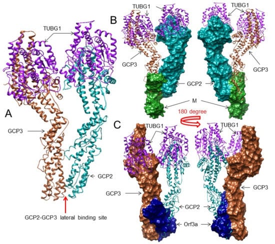 3.4. The M and ORF3a Proteins May Interact at GCP2–GCP3 Lateral Binding Sites