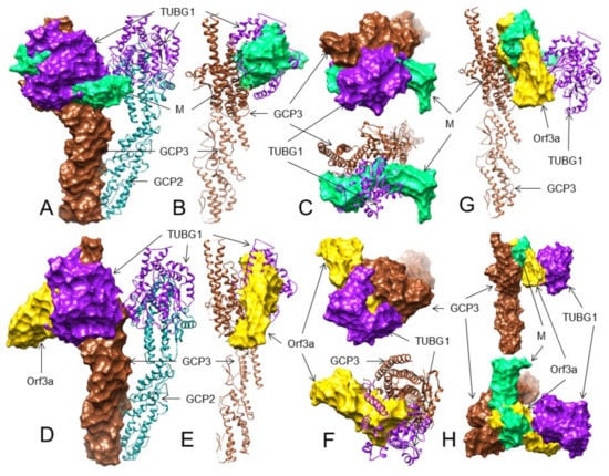 Taken together, our analysis suggests that the M protein may bind to TUBG1, blocking its binding to GCP3 more strongly than GCP2. The probable 3D interactions between TUBG1-M are shown in Table 3 and Table S3F, Figure 5A–D and Figure S49. Considering the number and specific residues of TUBG1 involved in GCP2 and GCP3 interactions, it is unlikely that the same residues interact with the ORF3a protein and interfere with TUBG1 binding to GCP2 and GCP3 (Table 3 and Table S4F, Figure 5E–H and Figure S54).