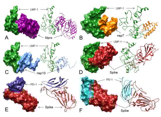 The 3D structures (surface and ribbon views) of SARS-CoV-2 proteins binding to LMP-1 and PD-1—Spike-RBD interactions. For interacting residues, see Table 4 and corresponding supplement 2D Figure(s). (A) 3CLpro/Mpro (dark magenta) binding to LMP-1 (forest green) (corresponding to complex 9, Figure S57, seven H-bonds); (B) NSP7 (orange) binding to LMP-1 (forest green) (corresponding to complex 7, Figure S60, eight H-bonds); (C) NSP10 (cornflower blue) binding to LMP-1 (forest green) (corresponding to complex 2, Figure S62, nine H-bonds); and (D) Spike protein (fire brick) binding to LMP-1 (forest green) (corresponding to complex 6, Figure S64, 5 H-bonds). (E) The Spike-RBD (fire brick) binding to PD-1 (dark slate blue) at its nivolumab binding sites (corresponding to complex 2, Figure S67, 8 H-bonds); and (F) The Spike-RBD (fire brick) binding to PD-1 (dark slate blue) at its pembrolizumab binding sites (corresponding to complex 8, Figure S69, 10 H-bonds).