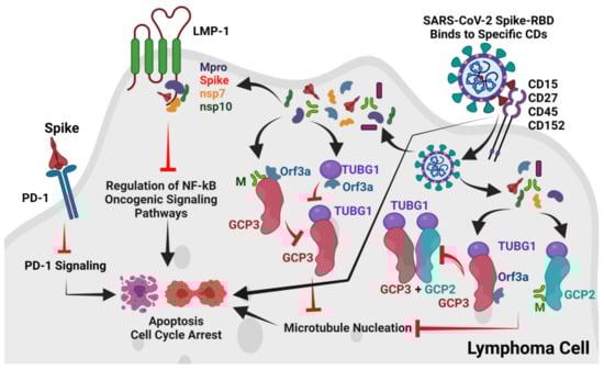 Proposed overall mechanisms of SARS-CoV-2 induced anti-tumor immune response in lymphoma. The SARS-CoV-2 Spike-RBD probably binds to CD15, CD27, CD45, and CD152 and may directly inhibit cell proliferation. Alternately, after binding to these CDs, SARS-CoV-2 may internalize into host cHL or FL cells. After entry into cancer cells, the M and ORF3a proteins block GCP2 –GCP3-TUBG1 interactions and thereby inhibit MT nucleation leading to cell-cycle arrest or cell death. Additionally, the SARS-CoV-2 Spike protein may also interact with PD-1 to block PD-1 signaling, leading to cell-cycle arrest or cell death. The SARS-CoV-2 Mpro, Spike, NSP7, and NSP10 were also found to potentially interact with the TRADD binding motif of the EBV oncogenic LMP-1 protein. This interaction may also lead to the regulation of the NF-kB oncogenic signaling pathway in cHL or FL. The Figure is developed by BioRender (www.biorender.com, accessed on 24 September 2021).