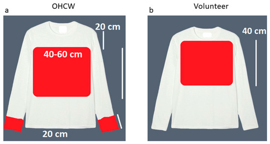 Long-sleeved fluid-resistant protective gown surfaces assessed for contamination (a) OHCW chest and wrists and (b) volunteer chest.