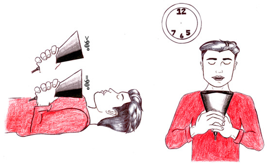 Larger, more expensive extra-oral high-volume suction devices have integrated suction motors and air filters. A recent study evaluated an extra-oral high-volume device positioned superior-perpendicular to the mannequin’s oral cavity. This extra-oral device achieved a significant reduction in operator contamination compared to high-volume evacuation [30]. A study identified the drilling side and corresponding location to be the ideal position for high-volume evacuation tips [21]. An advantage of the DASD design and large catchment area is that the device positioning for optimal aerosol and splatter reduction is achievable from multiple positions. The DASD device can be positioned on the chest of the patient anterior to the oral cavity (termed anterior-perpendicular in the 6 O’clock position) and laterally (5 and 7 O’clock positions) (Figure 3). This allows versatile positioning of the DASD device, which does not interfere with the working field of the operator and the position of the overhead light. The DASD is recommended to be positioned 10 to 15 cm from the working area. This provides the advantage of not impeding the OHCW’s field of vision, compared to high-volume suction that needs to be positioned up to 1 cm adjacent to the working field.