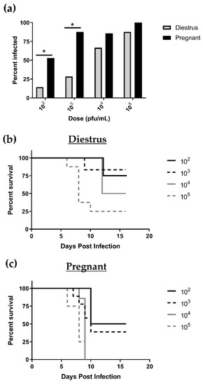 Next, survival percentages were assessed for HSV-2-infected mice in both groups up to 16 days post infection (dpi) (term pregnancy). Within the nonpregnant, diestrus-staged group, a proportion of mice survived to 16 dpi with all viral doses tested. Diestrus survival percentages ranged from 83% with 103 pfu/mL to 25% with 105 pfu/mL (Figure 1b). Pregnant animals fared significantly worse after HSV-2 infection, with only 39% of mice infected with 103 pfu/mL surviving to 16 dpi and 100% of animals infected with 104 and 105 pfu/mL succumbing to infection by 9 dpi (Figure 1c). Similar to the rates of infection, a 100-fold increase in susceptibility of pregnant animals was observed in our survival data, where 50% mortality occurred at a viral dose of 104 pfu/mL in nonpregnant, diestrus-staged controls compared to 102 pfu/mL in pregnant mice.
