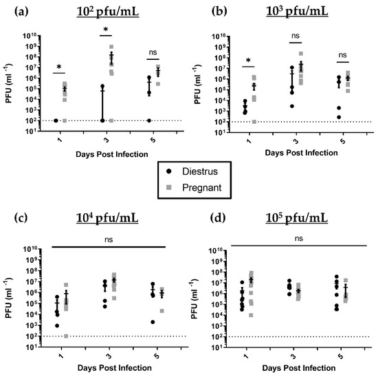 Viral shedding in vaginal washes collected from nonpregnant, diestrus-staged and pregnant mice at 1, 3 and 5 days post infection (dpi). (a) Following intravaginal (IVAG) infection with 102 pfu/mL HSV-2, pregnant mice had increased viral shedding in vaginal washes collected at 1 and 3 dpi compared to diestrus controls. (b) At a viral dose of 103 pfu/mL, higher rates of viral shedding were observed in pregnant mice compared to diestrus mice 1 dpi, but significant differences were absent at 3 and 5 dpi. In mice infected with high viral doses of (c) 104 and (d) 105 pfu/mL, there were no differences in viral titers in vaginal washes collected on any day. Data expressed as mean ± SEM. ns = not significant, * p < 0.05.
