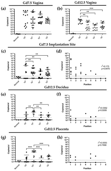 Since HSV-2 can infect placental tissues [37,38], we next asked whether the virus ascended from the vaginal tract to infect implantation sites at gd7.5 (3dpi), before establishment of the placenta at gd10.5 [36]. Healthy implantation sites were collected from animals sacrificed at gd7.5 and DNA was extracted from at least two individual implantation sites per mouse for qPCR quantification. At gd7.5 (3dpi), HSV-2 DNA was detected in implantation sites, indicting ascension from the vaginal tract (Figure 3c). Viral infection was observed in implantation sites in all groups, with comparable rate of infection among most viral doses (103, 104, 105 pfu/mL). However, significantly higher quantities of viral DNA were detected in the implantation sites of animals infected with 102 pfu/mL of HSV-2 (Figure 3c). Very little to no viral DNA was detected in implantation sites distal from the cervix, indicating that dissemination of the virus might be directional within the uterine horns. Indeed, correlation between implantation site position along the horn and viral load indicated that proximity to the cervix increased the risk of viral infection at gd7.5 (r2 = 0.1749; p = 0.0470) (Figure 3d).