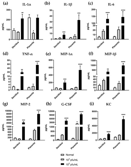 At the time of sacrifice (gd12.5), implantation sites were removed and decidua, placenta and fetus were carefully dissected; tissue weights were recorded prior to storage. Individual tissues were placed in 500 µL PBS in sterile RINO® tubes (TUBE1R5-S; FroggaBio, Toronto, ON, Canada) with a mixture of small and large stainless-steel beads. Tissues were homogenized for 5 min at 4 ℃ at maximum speed using a Bullet Blender® Gold Homogenizer (NextAdvance, Troy, NY, USA). Following homogenization, samples were centrifuged at 8000 rpm for 5 min. Supernatants were collected and stored at −80 ℃ until future use. For cytokine/chemokine analysis, 80 µL of undiluted tissue homogenate supernatant was sent to Eve Technologies (Calgary, AB, Canada) for quantification using a mouse 31-plex array (MD31; Eve Technologies). Cytokine/chemokine quantification was performed using 2 implantation sites from 3 pregnant gd12.5 mice in normal, low dose (103 pfu/mL) and high dose (105 pfu/mL) groups.
