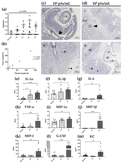 Since HSV-2 was detected in fetuses by qPCR and IHC, we next investigated whether viral infection in fetal tissues stimulated the production of inflammatory cytokines and chemokines using the same analytes detected in decidual and placental tissues: IL-1α, IL1-β, IL-6, TNF-α, MIP-1α, MIP-1β, MIP-2, G-CSF, and KC (CXCL1). Overall, cytokine levels in fetal homogenates were lower than those detected in the decidua and placenta; however, as in the decidua and placenta, inflammatory mediators in fetal tissues increased in a dose-dependent fashion. For all analytes measured, there were significant increases in cytokine/chemokine expression in fetuses from mice infected with high dose HSV-2 (105 pfu/mL) compared to controls (Figure 8e–m). Of the nine analytes, only IL-1α expression increased in comparison to controls in fetuses from animals infected with low dose HSV-2 (103 pfu/mL) (Figure 8e; p = 0.0023). Thus, taken together, in utero HSV-2 transmission to fetuses in animals infected with high doses of HSV-2 resulted in significantly increased expression of pro-inflammatory cytokines within fetal tissues.