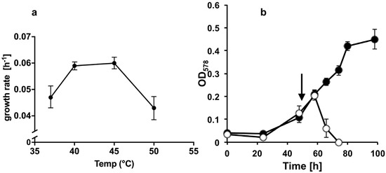 Growth rate of M. bourgensis E02.3 dependent on temperature (a) and lysis of by Blf4 virus at 45 °C (b); growth of M. bourgensis E02.3 was monitored at 578 nm over time and the growth rate (h−1) was calculated for the exponential phase. Filled circles: untreated cultures; open circles: cultures challenged with Blf4 after 48 h (arrow). To save space, the y-axis of (a) is shown discontinuously. The average values and their standard deviations (error bars) of three biological replicates are shown.