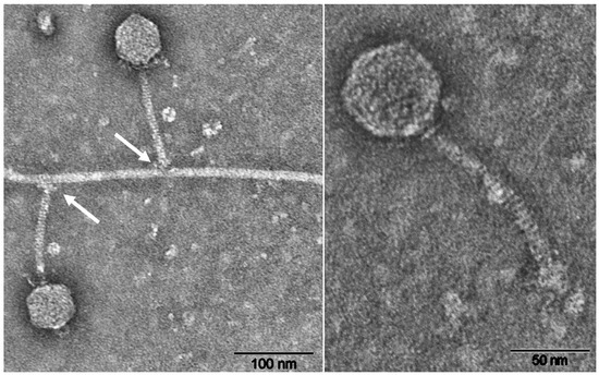 TEM micrographs of the Blf4 virus. Left: virus attachment to cell appendage (arrows), presumably flagellum. Right: a single virus displaying typical morphological characteristics of members of the Siphoviridae; Blf4 contains a hexagonal head (approximately 60 nm in diameter) and a non-contractile tail (approximately 125 nm in length and 10 nm wide). The samples were negatively stained with uranyl acetate (bars = 100 nm and 50 nm in the left and right images, respectively).