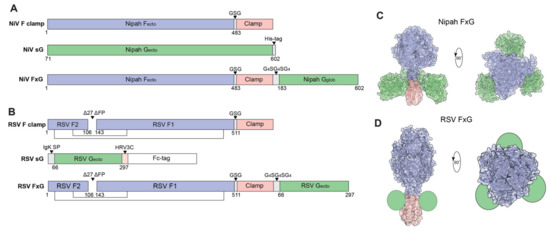 The attachment protein (G) of henipaviruses is a type II protein with a tetrameric (dimer of dimers) structure and is the primary target for vaccines and therapeutics, as it is involved in binding host cellular receptors ephrin B2/B3 [11,12,13,14]. Indeed, several protective epitopes within henipavirus G have been characterised [15,16,17,18,19] and vaccination with HeV G has yielded promising results in several animal models [20,21,22,23,24]. This lead to the licensure of an equine vaccine in Australia and the progression of this vaccine candidate into human clinical trials [25]. In contrast, the RSV G protein structure is not fully defined; however, the ectodomain is known to be heavily glycosylated, with glycans contributing to ~60% of the glycoprotein’s molecular mass [26,27,28]. Several neutralising and protective epitopes have been mapped to the central conserved domain (CCD) of RSV G [29,30,31,32], which has been implicated in binding to the fractalkine CX3C-chemokine receptor 1 (CX3CR1) [33,34,35,36]. After cellular attachment, both henipaviruses and orthopneumoviruses make use of a trimeric class I fusion protein (F) to merge viral and cellular membranes [10]. This is achieved by a structural transition of F from a metastable prefusion form to a highly stable postfusion form, driving the fusion of membranes and mediating viral entry [37,38,39]. It has been shown for both NiV and RSV that the prefusion conformation of F is most relevant for vaccine design, as this form is the main target of neutralising antibodies [37,40,41]. As such, several efforts have been made to stabilise henipavirus and RSV F proteins in the prefusion conformation through structure-based design and addition of a foldon or GCN4 trimerization domain [2,5,41].