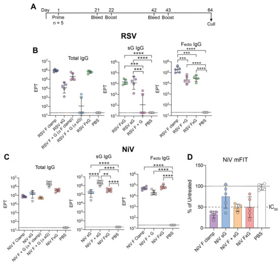 Immunogenicity of terminal bleed sera from NiV and RSV F, G, F + G and FxG vaccination in BALB/c mice. (A) Timeline of immunisation regimen employed. (B) Endpoint titres (EPT) of each RSV antigen group against vaccinated antigen/s (total IgG), RSV sG & RSV F ectodomain (Fectdo, DsCav foldon). (C) EPTs of each NiV antigen group against vaccination antigen/s (total IgG), NiV sG & NiV F ectodomain (Fecto, NiV F foldon). Dotted line shows limit of detection and data is expressed as geometric mean with geometric standard deviation (SD). p-values calculated using a one-way Tukey’s multiple comparison ANOVA on log transformed values, where * = p < 0.05, ** = p < 0.005, *** = p < 0.0005 and **** = p < 0.0001. (D) NiV-mFIT of a 1:40 dilution of serum samples from respective antigen groups. Data is expressed as a percentage of the average luciferase readings seen in untreated (no serum) controls with 50% inhibition (IC50) indicated as a dashed line. Each sample was assayed in triplicate with group mean and SD shown.