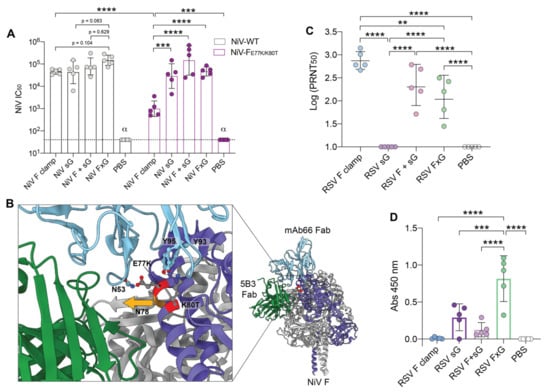 Terminal bleed sera neutralisation of NiV pseudovirus and RSV. (A) NiV antigen vaccinated sera neutralisation of WT-NiV or NiV-FE77K/K80T epitope-knockout pseudovirus. Dotted line shows limit of detection. (B) Structural representation of NiV-FE77K/K80T mutations. NiV F monomer coloured in purple with E77K and K80T mutations highlighted in red. 5B3 Fab (PDB 6TYS) coloured in green and mAb66 Fab (PDB 6T3F) coloured in cyan. Residues of 5B3 and mAb66 that interact with E77 or K80 on NiV-F are annotated & displayed as stick figures. A potential glycan site is formed on NiV F N78 (orange) with the proposed glycan orientation depicted by the orange arrow. (C) Serum samples from RSV groups tested in a plaque reduction neutralisation test (PRNT) against RSV A2 virus. In (A,C), data represents geometric mean with geometric SD and p-values calculated using Tukey’s multiple comparison ANOVA on log transformed values, where ** = p < 0.005, *** = p < 0.0005 and **** = p < 0.0001. α denotes p < 0.0001 against all groups unless otherwise specified. (D) RSV serum samples (1:10 dilution) tested for reactivity against the CCD of RSV G (MBP-CCD) in an indirect ELISA. Data shows mean with SD, with background binding against MBP subtracted. p-values calculated using a one-way Tukey’s multiple comparison ANOVA, where *** = p < 0.005 and **** = p < 0.0001. Non-significant comparisons are not denoted.