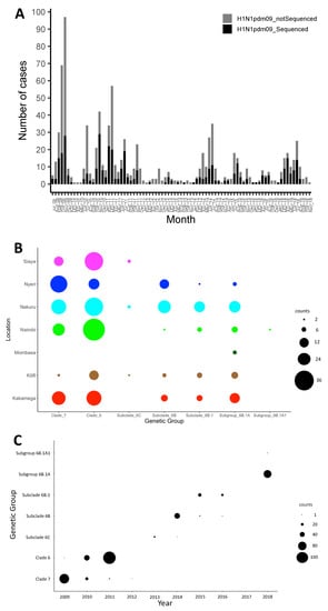 Distribution of influenza A(H1N1)pdm09 virus in Kenya, 2009–2018. (A) Bar plot showing number of A(H1N1)pdm09 virus-positive samples and sequenced positive samples by month between July 2009 and November 2018 in Kenya. All collected A(H1N1)pdm09 virus-positive samples and sequenced samples are indicated by color (all positive samples in gray—H1N1pdm09_notSequenced; sequenced samples in black—H1N1pdm09_Sequenced) as shown in the color key. (B) Bubble plot showing the distribution of genetic groups by location in Kenya, 2009–2018. (C) Distribution of genetic groups by surveillance year in Kenya, 2009–2018. The size of the circles in panels (B,C) is proportional to the number of samples, as shown in the counts key for the figures.