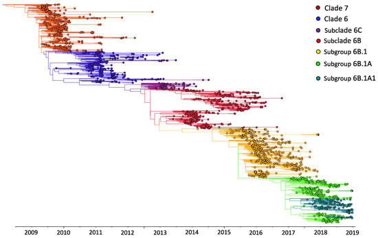 Consensus nucleotide sequences were aligned using MUSCLE (https://www.ebi.ac.uk/Tools/msa/muscle/; accessed on 11 March 2021) and translated in AliView v1.26 [38], and the individual gene segments of Kenyan sequences were concatenated into codon-complete genomes using SequenceMatrix v1.7.8 [39]. Phylogenetic trees of A(H1N1)pdm09 virus genomes from Kenya and contemporaneously sampled global sequences were reconstructed with maximum-likelihood and bootstrap analysis of 1000 replicates. The best-fit nucleotide substitution models were inferred using IQ-TREE v1.6.11 [40,41] and those chosen by the Bayesian Information Criterion for each concatenated virus genome implemented. The phylogenetic trees were visualized and annotated using Figtree v1.4.4 (http://tree.bio.ed.ac.uk/software/figtree/; accessed on 12 March 2021) and ggtree [42]. The full-length hemagglutinin (HA) codon sequences of all viruses were used to characterize A(H1N1)pdm09 virus strains into genetic groups (i.e., clades, subclades, and subgroups) using Phylogenetic Clustering with Linear Integer Programming (PhyCLIP) [43] and the European CDC Guidelines (https://www.ecdc.europa.eu/en/seasonal-influenza/surveillance-and-disease-data/influenza-virus-characterisation; accessed on 12 March 2021). Representative reference sequences for genetic clade assignment were included.