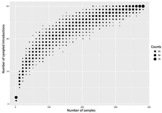 Number of introductions of A(H1N1)pdm09 viruses into Kenya depending on how many random sequences from Kenya were used to infer introductions.