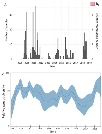 - Stadler, T.; Kühnert, D.; Bonhoeffer, S.; Drummond, A. Birth-death skyline plot reveals temporal changes of epidemic spread in HIV and hepatitis C virus (HCV). Proc. Natl. Acad. Sci. USA 2012, 110, 228–233. [Google Scholar] [CrossRef]