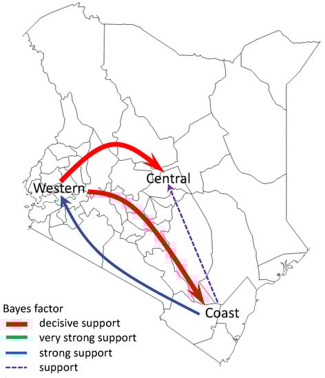To infer the patterns of spread of A(H1N1)pdm09 virus among three geographical regions of Kenya (central Kenya, western Kenya, and coastal Kenya), we summarized and visualized its geographic spread over time on the basis of significant rates of spread between the geographical regions. We observed significant rates of spread from western Kenya to central and coastal Kenya. Additionally, we observed supported rates of spread from coastal Kenya to western and central Kenya (Figure 6).
