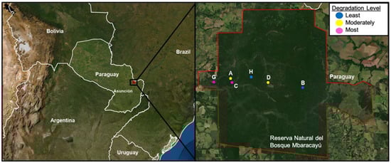 The left panel shows the location of the Reserva Natural del Bosque Mbaracayú (RNBM) in eastern Paraguay near the border with Brazil and is represented with a black box. In the right panel, an enlarged photograph of the RNBM is outlined in red, and the location of the grids is shown. Rodents were sampled from six grids (three enclosed—H, D, C) and three unenclosed—B, A, G). Grids were designated as “least degraded”—B and H, “moderately degraded”—A and D, and “most degraded”—G and C. The image was made using ArcGIS® software by Esri. ArcGIS® and ArcMap™ are the intellectual property of Esri and are used herein under license. Copyright © Esri. All rights reserved.