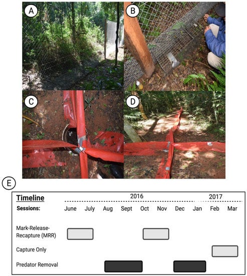 Experimental field design. (A) Photo taken of the two-meter-high chain link fencing that was constructed on the three experimental grids—H, D, C. (B). Cage trap placed against the inside of the fences, also showing the half-meter high small-mesh chain link fencing. (C) Pitfall trap used to capture small terrestrial mammalian predators. (D) Image of four 5 m drift fences extending in the four cardinal directions from the pitfall trap mouth. (E) Timeline of the study. Pre-treatment sampling (PreTrt) was performed during the winter during June–July 2016. The first post-predator removal session was performed at the beginning of the summer during October–November (ON2016). The final capture only session was performed at the end of the summer during February–March 2017 (FM2017). The timeline image was created with BioRender.com, accessed on 18 September 2021.