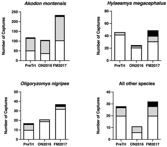 The number of unique individuals per session by age class for Akodon montensis, Hylaeamys megacephalus, Oligoryzomys nigripes, and all other species. Juveniles are shaded in black, subadults are shaded in light gray, and adults are shown in white. Pre-treatment sampling (PreTrt) was performed during the winter during June–July 2016. The first post-predator removal session was performed at the beginning of the summer during October–November (ON2016). The final capture only session was performed at the end of the summer during February–March 2017 (FM2017).