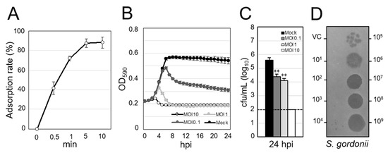 Lytic activity of ΦSG005 against S. gordonii ATCC10558. (A) Adsorption rate of ΦSG005 on S. gordonii ATCC10558 presented as means ± SD (n = 4). (B) Lytic curves of S. gordonii ATCC10558 growing in the presence of ΦSG005 were obtained by monitoring the OD590 until 24 hpi. ΦSG005 was inoculated at an MOI of 10, 1, and 0.1. The individual points in each lytic curve are presented as means ± SD (n = 4). (C) Viable cells from the culture at 24 hpi are presented as means ± SD (n = 4). 1.0 × 102 cfu/mL was the limit of detection. Significance was analyzed by Tukey’s test based on one-way ANOVA analysis and is indicated by asterisks (** p < 0.01). (D) Representative spots and plaques on a lawn of S. gordonii ATCC10558 produced by ΦSG005. VC means vehicle control (SM buffer only).
