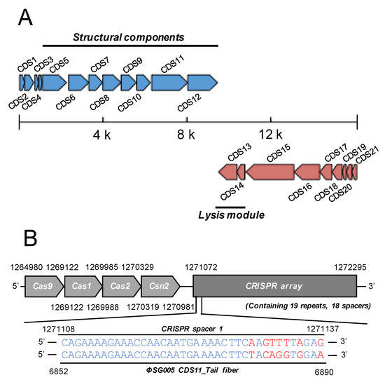 Genome structure of ΦSG005. (A) ΦSG005 possesses 16,127 bp and a total of 21 CDSs indicated as blue or red arrows (complementary). Putative structural components (from CDS4 to CDS12) and putative lysis modules (CDS13 and CDS14) are marked by solid lines. (B) A section of the CRISPR-associated region in S. gordonii ATCC10558 is depicted. S. gordonii ATCC10558 harbors the type II CRISPR-Cas system composed of Cas9, Cas1, Cas2, and Csn2 (1,264,980–1,270,981 bp). The CRISPR array contains 19 repeats and 18 spacer sequences. One of the CRISPR spacers located at the most 5′ proximal region in the CRISPR array (represented as CRISPR spacer 1) shows high similarity with the sequence of the ΦSG005 CDS11 predicted tail fiber.