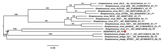 Phylogenetic analysis using the whole-genome sequence of ΦSG005. The phylogenetic tree was constructed by VICTOR using 14 whole-genome sequences of all streptococcus master species registered by the International Committee on the Taxonomy of Viruses (ICTV). The red circle indicates ΦSG005. S, G, and F after the phage names refer to species, genus, and family clusters, respectively.
