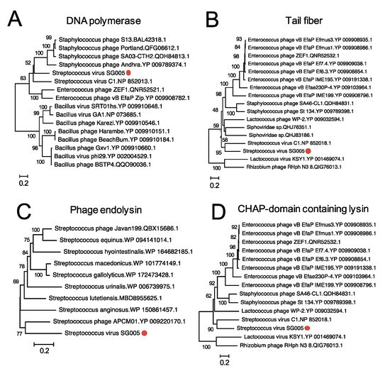 Phylogenetic analysis of some CDSs of ΦSG005. Phylogenetic trees of DNA polymerase (A), tail fiber protein (B), endolysin (C), and CHAP-domain containing lysin (D) were constructed by the neighbor-joining method (1000 replications) based on the full-length amino acid sequences. Bootstrap values are shown on the branch nodes, and the scale bar represents a distance of 0.2 substitutions per site. Red circles indicate ΦSG005.
