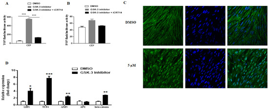 GSK-3 inhibitor X, an acetoxime analog of 6-bromoindirubin-3′-oxime (BIO), has been utilized to activate Wnt/β-catenin signaling by stabilizing β-catenin from the degradation complex in mammalian studies [28,29]. However, there is no such reference study in chicken cells. We first determined the effects of GSK-3 inhibitor X on the Wnt/β-catenin signaling pathway in CEF cells.