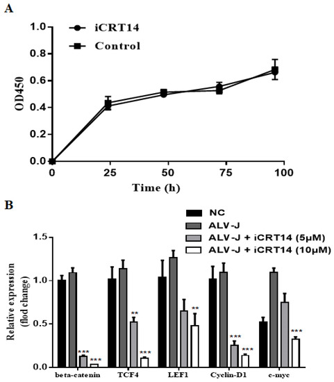 iCRT14 inhibited the Wnt/β-catenin signaling pathway in CEF cells. (A) CEF cells were treated with iCRT14 (10 μM) or vehicle control for various times (24, 48, 72, 96 h), and the cell viability was detected by OD450 with CCK-8 kit. Data are expressed as the mean ± SD of three independent experiments. (B) The gene expression levels of Wnt/β-catenin signaling-pathway-associated genes and target genes were quantified by real-time RT-PCR. Data were expressed as mean ± SD from three independent experiments and analyzed by Student’s t-tests (** p < 0.01, *** p < 0.001). These experiments were performed independently at least three times with similar results.
