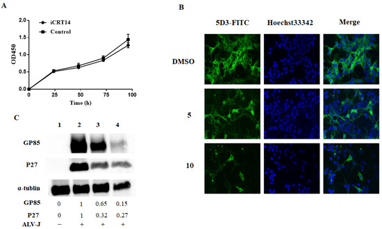 According to the results shown in Figure 1A, we chose iCRT14, a Wnt signaling inhibitor that disrupts the interaction between β-catenin and TCF4 [30], to examine the effect on ALV-J replication in CEF. We first validated that iCRT14 inhibited the Wnt/β-catenin signaling pathway by crippling pathway-associated gene expression at a noncytotoxic concentration (5 and 10 μM) in CEF cells (Figure 3A,B).