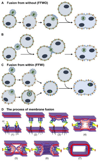 Simplified view of the different types of virus-induced membrane fusion. (A) Fusion from without (FFWO): The virus envelope carries glycoproteins, mediating the fusion of the viral envelope with the plasma membrane. The viral envelope is retained on the surface of the infected cell. Envelope glycoproteins interact with receptors on neighboring cells and mediate cell–cell fusion. (B) FFWO can also occur when a viral particle fuses simultaneously with two cells. (C) Fusion from within (FFWI): The virus enters the cell through fusion with the plasma membrane or through endocytosis. Viral gene expression leads to the synthesis of envelope glycoproteins that may be transported to the cellular surface. Viral glycoproteins interact with receptors on adjacent cells and induce cell–cell fusion. (D) Schematic of the membrane fusion process. (1) Activation of the fusion machinery and exposure of specific fusion peptides (FP). (2) Insertion of the FP into the adjacent membrane. (3) Refolding of the FP and induction of membrane deformation. (4) Formation of a transient hemifusion diaphragm. (5) Opening of a fusion pore that completes merging of both membranes. (6) Expansion of the fusion pore. (7) Situation after membrane fusion (postfusion).