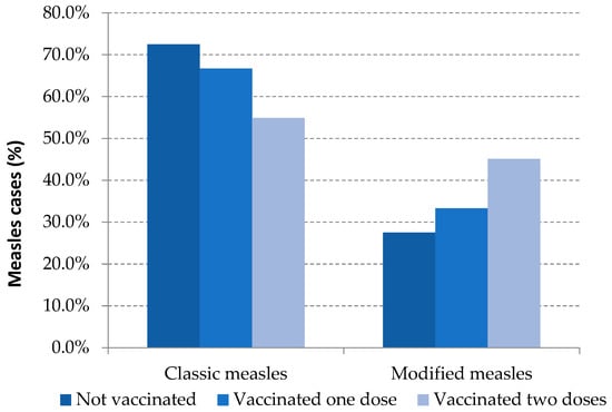 Modified measles was the clinical presentation in 31.2% of the total reported cases: 27.5% were unvaccinated cases, 33.3% were those with one dose of MMR and 49.6% were fully vaccinated cases. These differences were statistically significant between unvaccinated and vaccinated with two or more doses (Table 3, Figure 2).