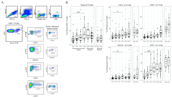 γδ T cell frequencies and phenotypic markers of activation increase with age and CMV infection. (A) Gating strategy for conventional flow cytometry panel. Initial flowCut cleaning in FlowJo was followed by singlet, lymphocyte, live and CD3+ gates as shown. γδ T cells were then gated as either CD16+, CD56+, NKG2C+ and CD57+. Positive gates were set using an internal positive biological control with known expression levels; (B) Total γδ T cells and CD16+, CD56+, NKG2C+ and CD57+ γδ T cells grouped by age. Infants (2, 4, 8 and 12 months of age), children (1–2 and 2–8 years old) and adult mothers were stratified by HIV serostatus (HIV-infected n = 17, HIV-uninfected n = 15); (C) γδ T cells from CMV-infected (n = 20) and CMV-uninfected infants (n = 8). Top row depicts cell frequencies in longitudinal samples from CMV-infected (n = 43) and CMV-uninfected (n = 57) infants (all time points) and the bottom row represents the same data plotted by both CMV infection and age in months. A mixed methods linear regression model accounting for repeated measures and testing for age, sex and HIV exposure in utero was used to determine statistical associations. Horizontal bars represent the median; boxes extend to the 25th and 75th percentile and whiskers represent the 95th percentiles. p-values were adjusted for multiple comparisons (each cell population tested); one asterisk (*) indicates p < 0.05, three (***) indicates p < 0.001. Statistical differences between HIV-infected and -uninfected mothers were determined using a Wilcoxon–Mann–Whitney test.