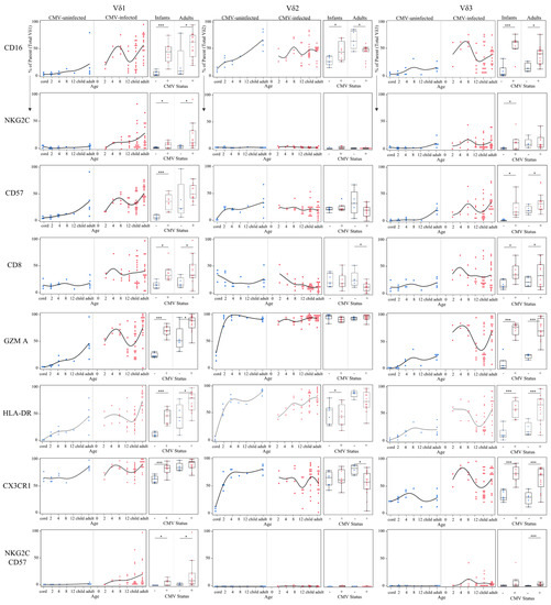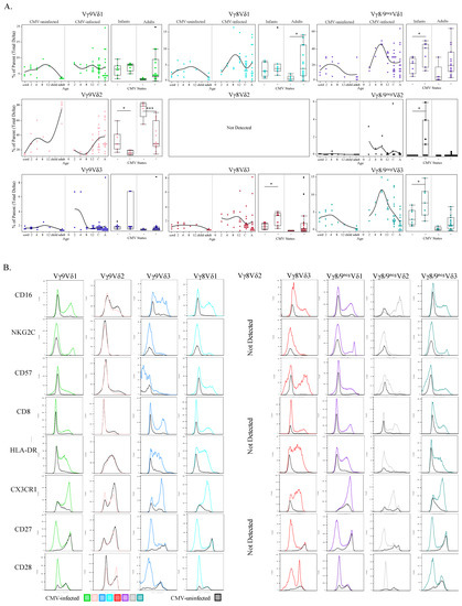 3.4. Phenotypic Differences of γδ T Cell δ-Subsets between CMV-Infected and CMV-Uninfected Infants and Adults