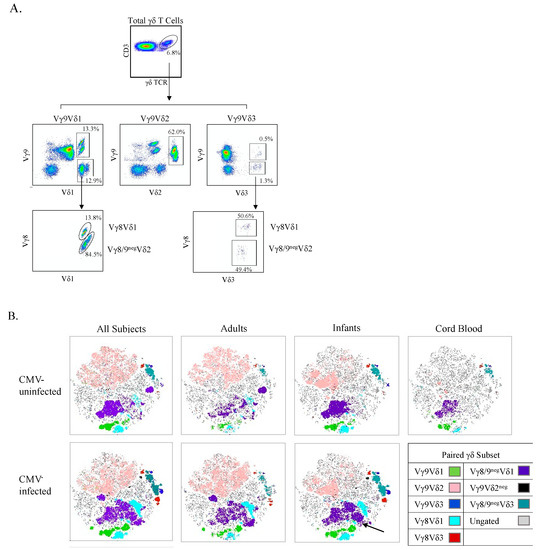 To visualize unique clusters of cells associated with CMV infection, we used a combination of unsupervised t-SNE plots and an overlay of manually gated paired γδ T cell subsets from spectral flow cytometry (Figure 6B). Consistent with data from manual gating analyses presented above, CMV-associated γδ T cell clusters included all Vδ1 subsets (paired with Vγ8 shown in light blue, Vγ9 in green, and Vγ8neg/9neg in purple). In infants only, we could observe Vγ9negVδ2 and Vγ9Vδ3 T cell clusters that were unique to CMV-infected individuals, shown in black and blue, respectively, in Figure 6B. The visual representation provided by the t-SNE plots illustrates that within manually gated paired γδ T cell subsets there were unique clusters that were associated with CMV infection. For example, the largest Vγ8neg/9negVδ1 T cell cluster (purple) appears to be naïve, given its presence in cord blood and CMV-uninfected infants; however, several Vγ8neg/9negVδ1 T cell clusters appear to the right of it in both CMV-infected infants and adults. This trend of subsets having two or more clusters of one γ- and δ-paired TCR subset where one of them appears only in CMV-infected subjects is apparent for all the subsets examined, except for Vγ9negVδ2 T cells (infants only) cells and the Vγ9Vδ2 T cells (shown in pink).