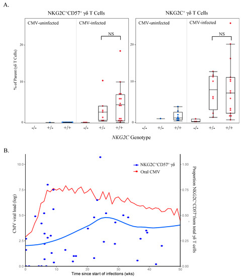 3.6. NKG2C+CD57+ γδ T Cell Frequency Is Associated with NKG2C Genotype and CMV Shedding In Vivo