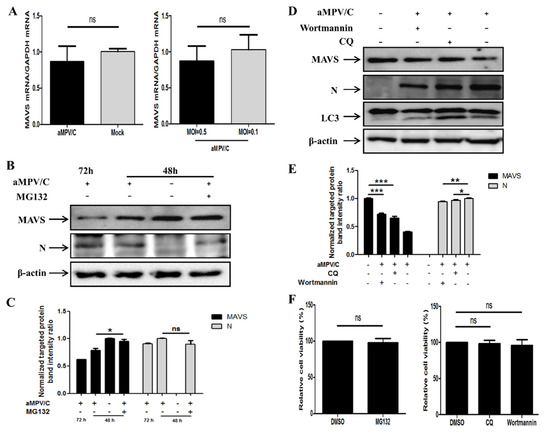 The change of protein expression is mainly attributed to two aspects of regulation: transcriptional levels and post-translational levels. Since it was initially found that the decrease in MAVS expression occurred at 48 h after infection (Figure 1A), we analyzed which regulation of transcription or translation played a major role in the decrease in MAVS. To determine whether the reduction in MAVS occurs at the transcriptional level in aMPV/C-infected Vero cells, the levels of MAVS mRNA were measured by qRT-PCR. As shown in Figure 2A, no significant differences in MAVS levels were observed between aMPV/C-infected cells and mock-infected cells at 48 h after virus infection. Moreover, a similar result was found at different inoculation doses in virus-infected Vero cells (Figure 2A). These results indicate that the mRNA level of MAVS was not affected by aMPV/C infection at 48 h. In other words, the reduction in MAVS induced by aMPV/C infection did not occur at the transcriptional level at 48h after virus infection.