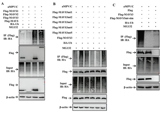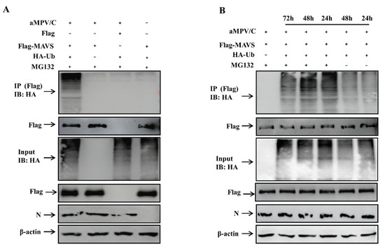 To determine whether aMPV/C infection can catalyze polyubiquitin chain formation on MAVS, we conducted ubiquitination assays in Vero cells. The cells were co-transfected with Flag-MAVS and hemagglutinin (HA)-Ub plasmids, followed by aMPV/C infection and an immunoprecipitation assay at 48 h. As shown in Figure 3A, aMPV/C infection induced polyubiquitin chains formation and MAVS polyubiquitination. In addition, MAVS polyubiquitination was analyzed at 24, 48, and 72 hpi. The immunoprecipitation results showed that addition of MG132 blocked MAVS degradation and increased MAVS polyubiquitination at different time points in aMPV/C-infected Vero cells (Figure 3B). Collectively, these results indicate that aMPV/C infection promotes the formation of polyubiquitin chains and final degradation of MAVS.