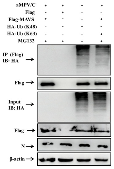 To determine the pattern of MAVS ubiquitination in aMPV/C-infected Vero cells, we co-transfected Vero cells with plasmids encoding Flag-MAVS or Flag and HA-Ub-K48 or HA-Ub-K63, followed by aMPV/C infection and an immunoprecipitation assay. The data showed that aMPV/C-induced K48-linked ubiquitination of MAVS was stronger than K63-linked ubiquitination (Figure 4). This indicates that MAVS mainly undergoes K48-linked ubiquitination in the presence of MG132 in aMPV/C-infected Vero cells.